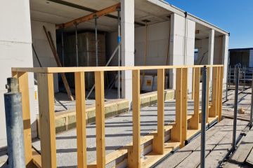 Inmiddels zijn de tweede verdiepingsvloeren gelegd, hier kan dus gestart worden met het lijmen van het kalkzandsteen. Verder zijn we nu bezig met het aanbrengen van het regelwerk voor de houten buitengevels en met de voorbereidingen voor het gevelmetselwerk. Begin juli zal met dit metselwerk gestart worden. Ook zullen we binnenkort starten met het aanbrengen van de buitenkozijnen op de eerste verdieping.
